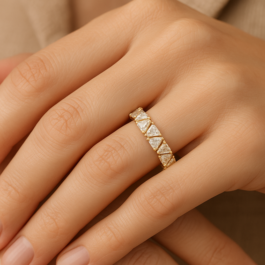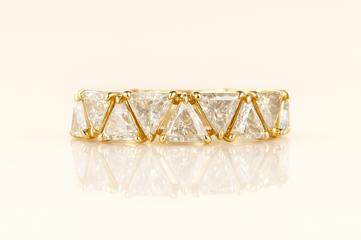 The Trilliant Band is an exquisite piece, meticulously crafted from 14k solid yellow gold and adorned with remarkable triangle diamonds, each ranging from .99 to 1.13 carats. The distinctive cut of these high-quality diamonds guarantees that you'll command attention and radiate brilliance on every occasion, making it a captivating and truly dazzling addition to your collection.